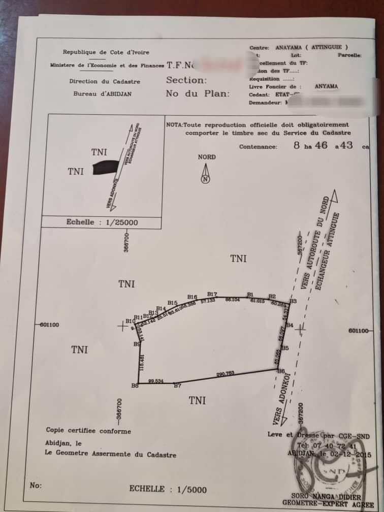 ▪Mise en vente d’une parcelle de 8ha 46a 43ca soit 84643m² situé à 2 Km de l’autoroute dans le sens Abidjan-Yakro du côté gauche à la descente du pont D’ATTINGUIE village.